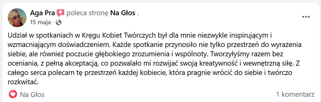 Widzę na co dzień u kobiet biorących udział w moich warsztatach, jak wielki potencjał twórczy drzemie w każdej z nich i jak wiele może zmienić w życiu odblokowanie go. Chcę nieść to dalej!